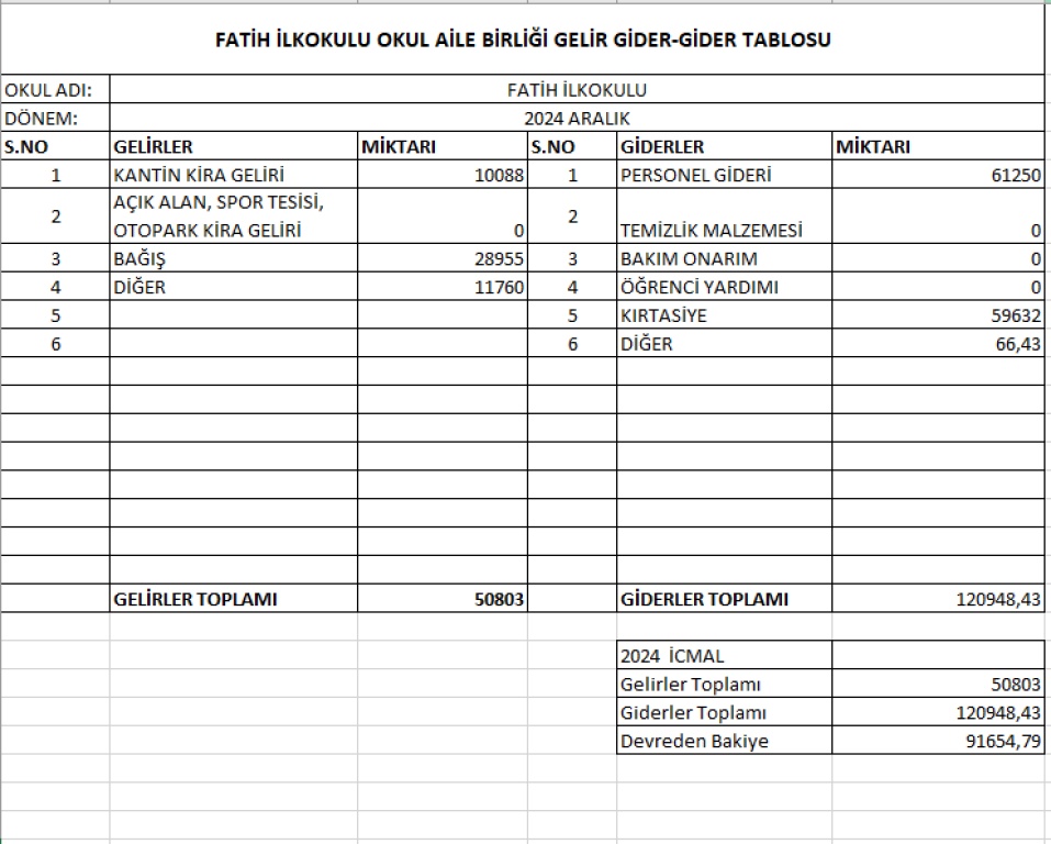 ARALIK AYI OKUL AİLE BİRLİĞİ GELİR GİDER BİLANÇOSU